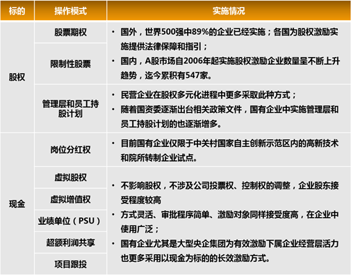 從國(guó)內(nèi)外企業(yè)實(shí)施經(jīng)驗(yàn)來看,主要分為以股權(quán)或現(xiàn)金為標(biāo)的的兩類激勵(lì)方式,常見的操作模式包括: